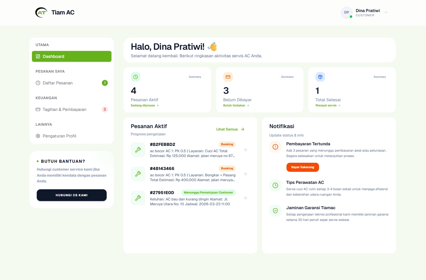 Sistem reservasi otomatis yang menyesuaikan ketersediaan teknisi dengan lokasi pelanggan secara real-time.