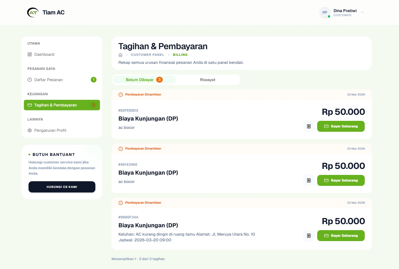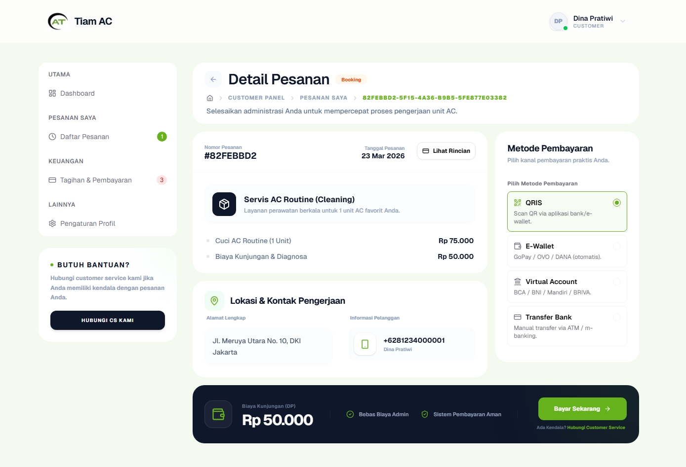 Sistem pembayaran nontunai yang terintegrasi dengan invoice otomatis yang dikirim setelah pekerjaan selesai.
